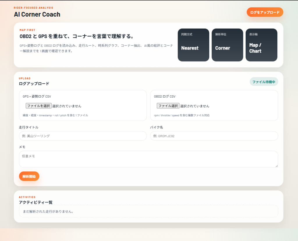 - AI分析: データをAIに読み込ませて、自分のライディングのクセを分析する。
